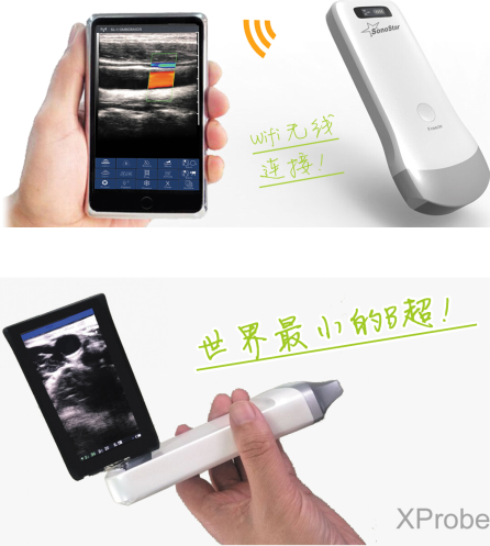 索诺星(Sonostar)科技有限公司的无线探头式迷你B超/彩超产品为国内第一家推出的产品,也为市场独家产品,在国际市场也具有绝对性的产品优势市场常有率在60%以上。产品以其非常小巧轻便且无线连接,携带、操作都极其方便,非常适合临床各种插针插管和微创手术的可视化引导,以及各类医疗急救的使用,医护人员能随身携带放于口袋,随时拿出快速开机快速完成检查,如果有需要还可借助手机把超声成像图像发给远程医生寻求协助会诊。产品价格也非常低廉,有利于普及成为每个医护人员、每个基层医疗单位必备的诊疗工具。产品项目获得了国家十三五规划科技部重点研发项目立项和一千万元的研发资助。该产品的研发源于客户的需求,也基于我们对产品创新的不断追求。传统的超声仪器也就是B超、彩超,都是体积比较大,即使有便携式、掌上式的也还是要一大块的体积,且都是主机+探头组成,主机与探头之间连着线,这样携带和使用都很不方便。
