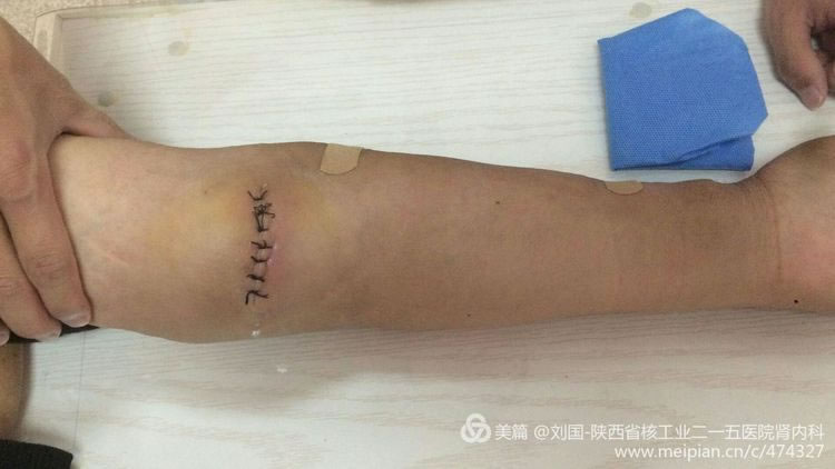 He is hospitalized this time for internal arteriovenous fistula’s cephalic vein tumor-like expansion and thrombegenesis appears in his right forearm, which blocks his cephalic vein from his orificium fistulae to elbow. After his internal fistular was blocked, he performed the internal arteriovenous fistular operation in Xi’an Hospital. When he came to our hospital, the catheterization hemodialysis in his right jugular vein was being executed, part of his right forearm’s orificium fistulae was swelling with severe pain, and his internal thrombus had been organized, which brought much organized thrombus in the cephalic vein from orificium fistulae to elbow without obvious lacuna.