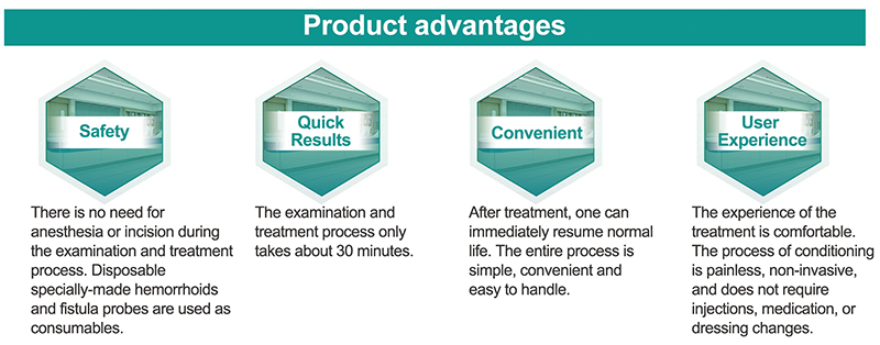 The electrotherapy for hemorrhoids is an innovative and improved physical therapy method based on the traditional Chinese medicine theory of dry hemorrhoid therapy and the theory of microcurrent electrochemistry. It is a painless, non-invasive, and anesthesia-free treatment for internal and mixed hemorrhoids. It is suitable for people with damp-heat descending, qi stagnation and blood stasis, spleen deficiency and qi sinking, and yin deficiency and intestinal dryness. Through the intelligent microcurrent physical therapy device and the specially designed hemorrhoid probe (Yue Su Medical Device No. 20250319), under the action of the microcurrent electric field, it can quickly cause the occlusion of the hemorrhoid vascular clusters, leading to the atrophy of the hemorrhoid body and the cessation of bleeding. This painless, non-invasive, and anesthesia-free characteristic physical therapy truly realizes the new concept of "non-invasive hemorrhoid interruption" without pain.