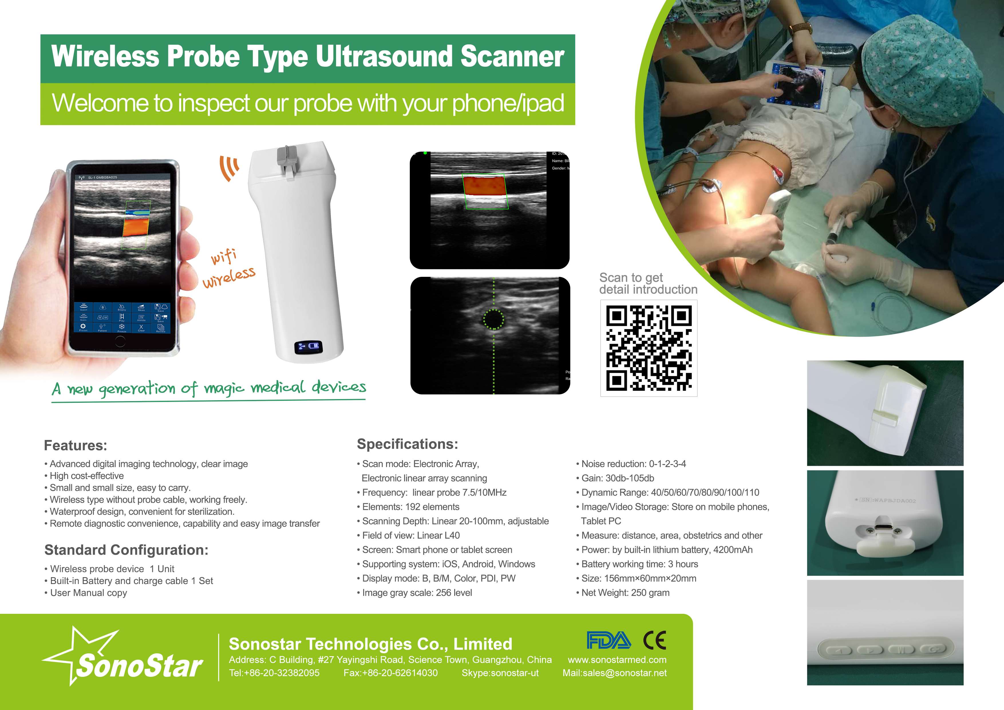 wireless probe type color doppler ultrasound scanner, 192 element