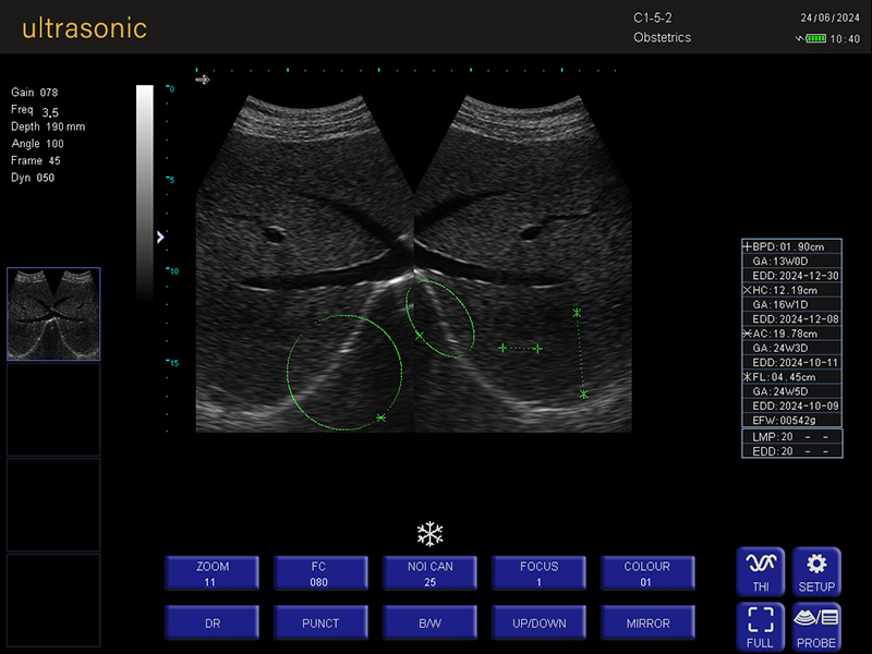 d) Obstetric: 43 measurements including gestational sac, double parietal diameter, head circumference, abdominal circumference, femur length, fibula length, head buttock diameter, yolk sac, abdomen, large and small brain, last menstruation, amniotic fluid, gestational age, expected date of delivery, fetal weight etc,With different ethnic measurement formulas