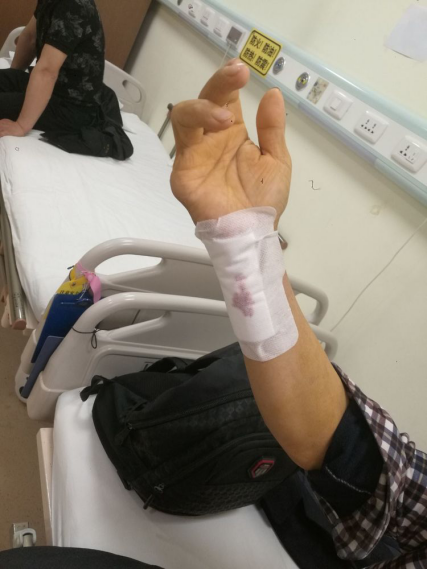 男性患者,已行血液透析半年余,于外院行桡动脉头静脉内瘘成形手术,双手桡动脉均已做过。左手如图: