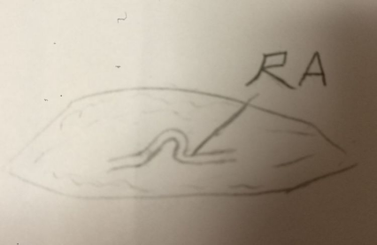 游离尺动脉以后发现尺动脉迂曲得比较厉害。(又忘记留图了,画得不好看,意会吧)