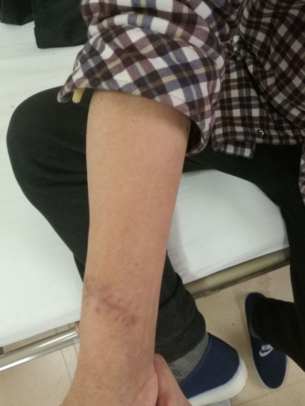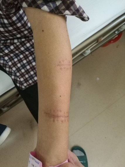 经彩超检查,双手桡动脉内径均不足1.5mm,血流速度20cm/s,均不足30cm/s。且双侧头静脉均闭塞。(忘记留图了)在查体时突然发现患者右上肢贵要静脉如图: