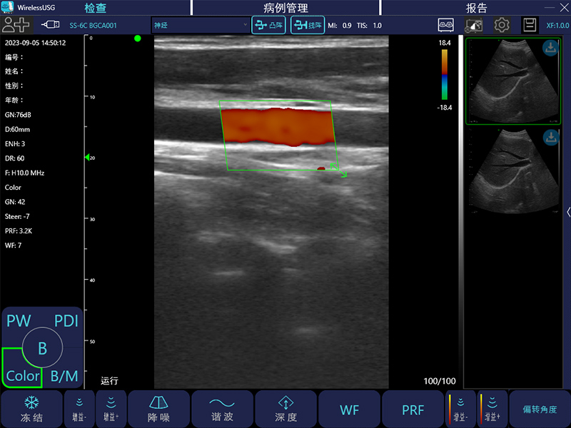 - 图像调节:黑白图像增益、分段增益TGC、动态范围、焦点、深度、反相脉冲谐波、降噪、彩色增益、血流采样框大小、PRF