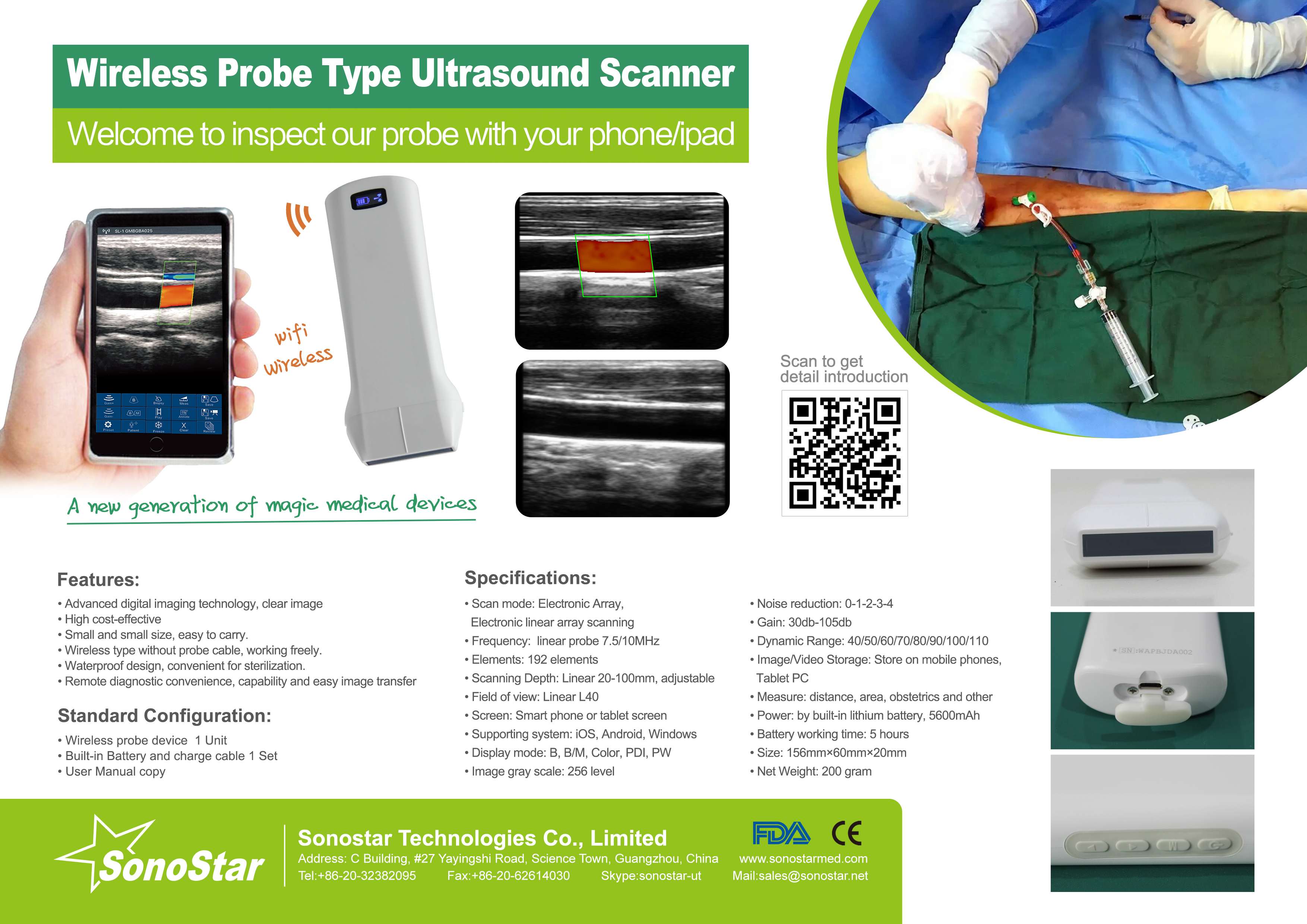 wireless probe type color doppler ultrasound scanner, 192 element