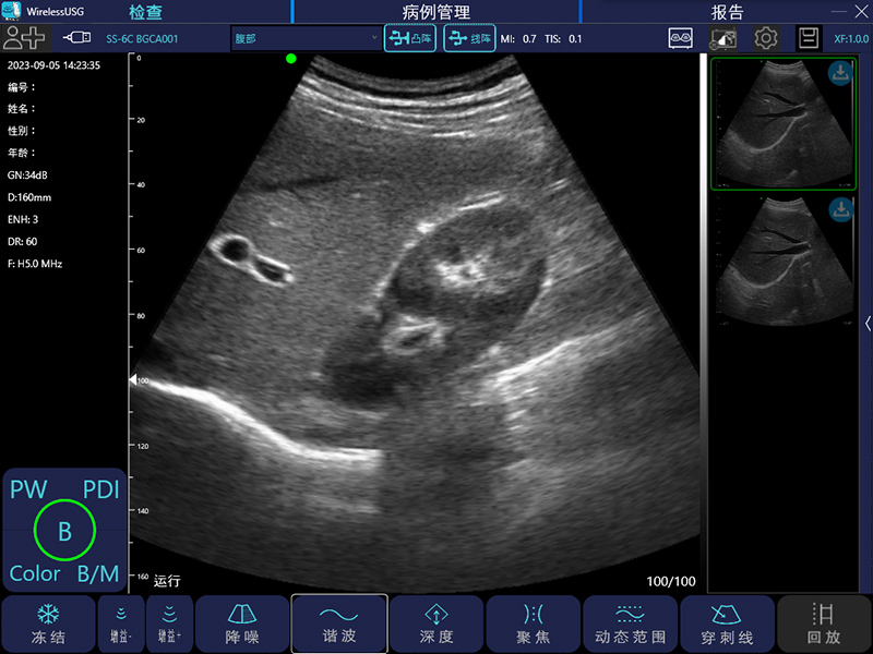 - 图像调节:黑白图像增益、分段增益TGC、动态范围、焦点、深度、反相脉冲谐波、降噪、彩色增益、血流采样框大小、PRF